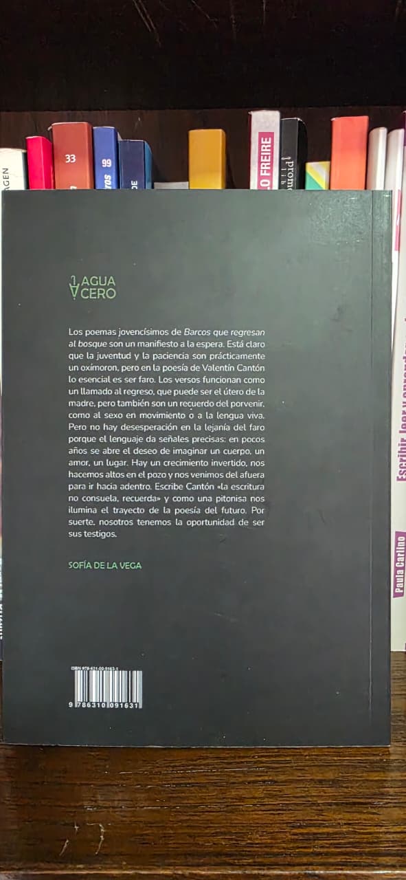 Los poemas jovencísimos de Barcos que regresan al bosque son un manifiesto a la espera. Está claro que la juventud y la paciencia son prácticamente un oxímoron, pero en la poesía de Valentín Cantón lo esencial es ser faro. Los versos funcionan como un llamado al regreso, que puede ser el útero de la madre, pero también son un recuerdo del porvenir, como al sexo en movimiento o a la lengua viva.